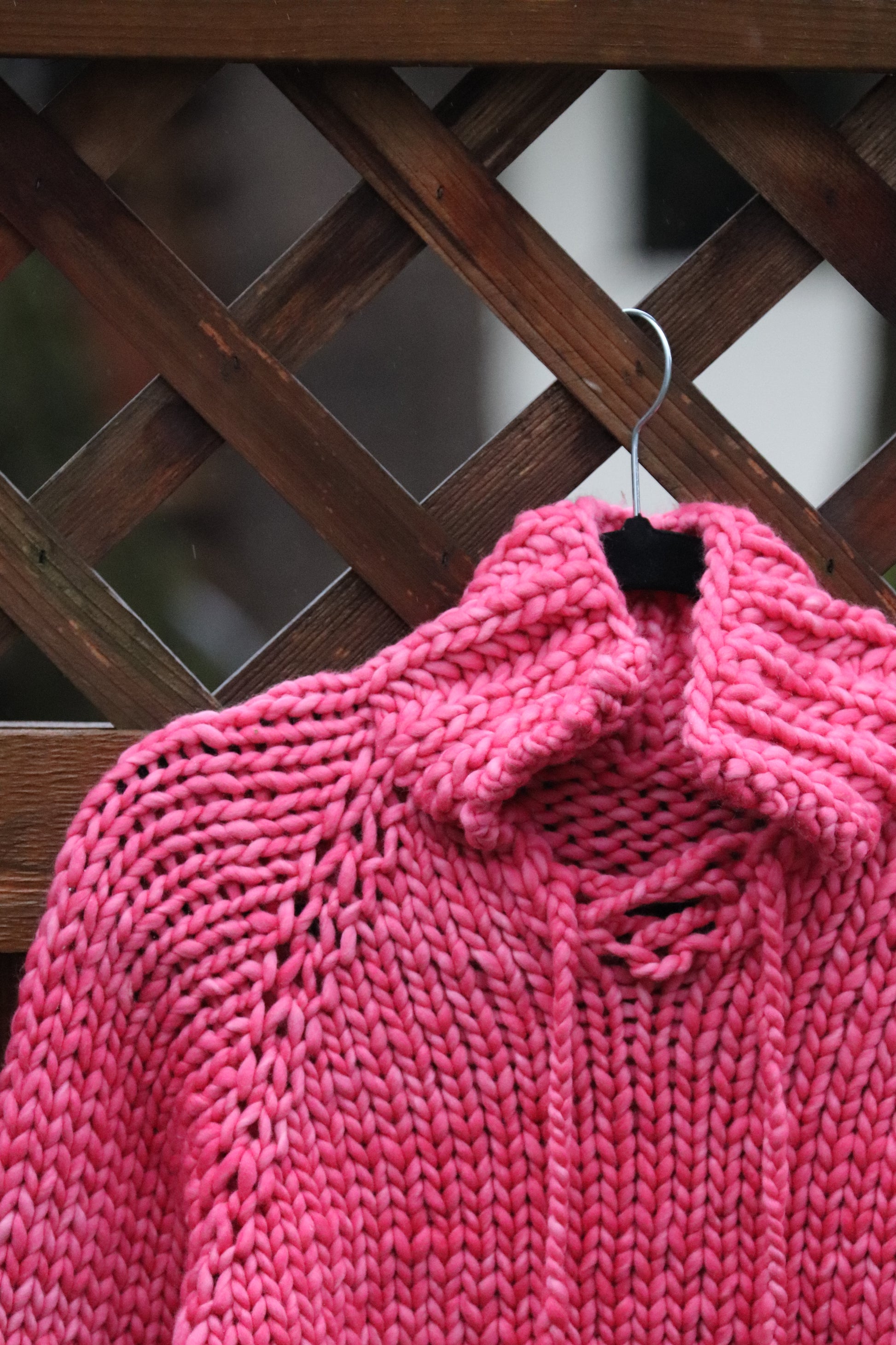 This V neck style pullover is finished with a braided tie and a fisherman ribbed collar. This piece is designed as a bomber jacket length piece. Knit up in Cactus Flower pink, this piece adds a POP of color while remaining subtle enough for diversity of wear.